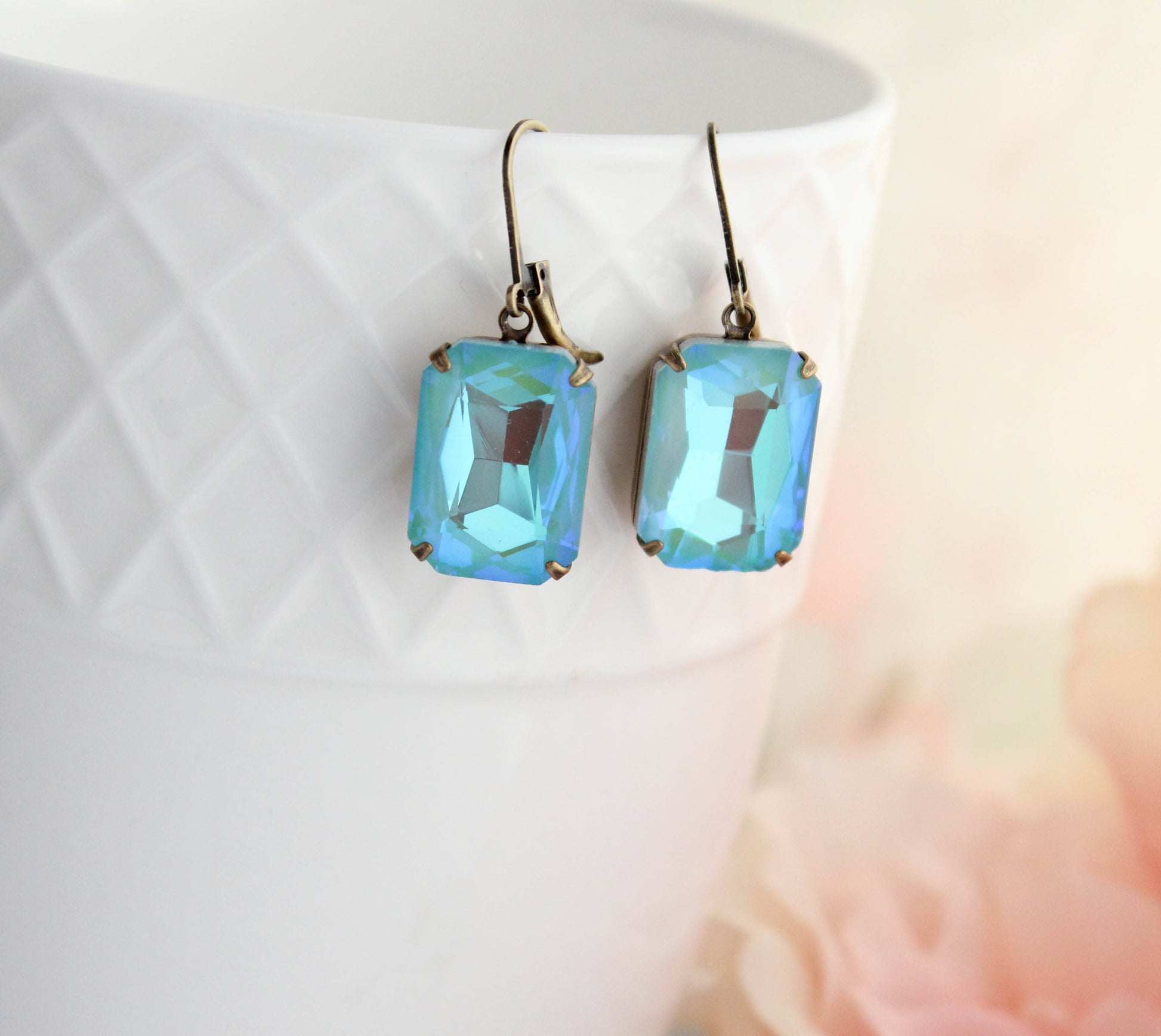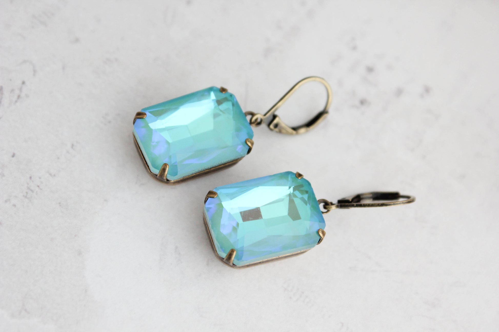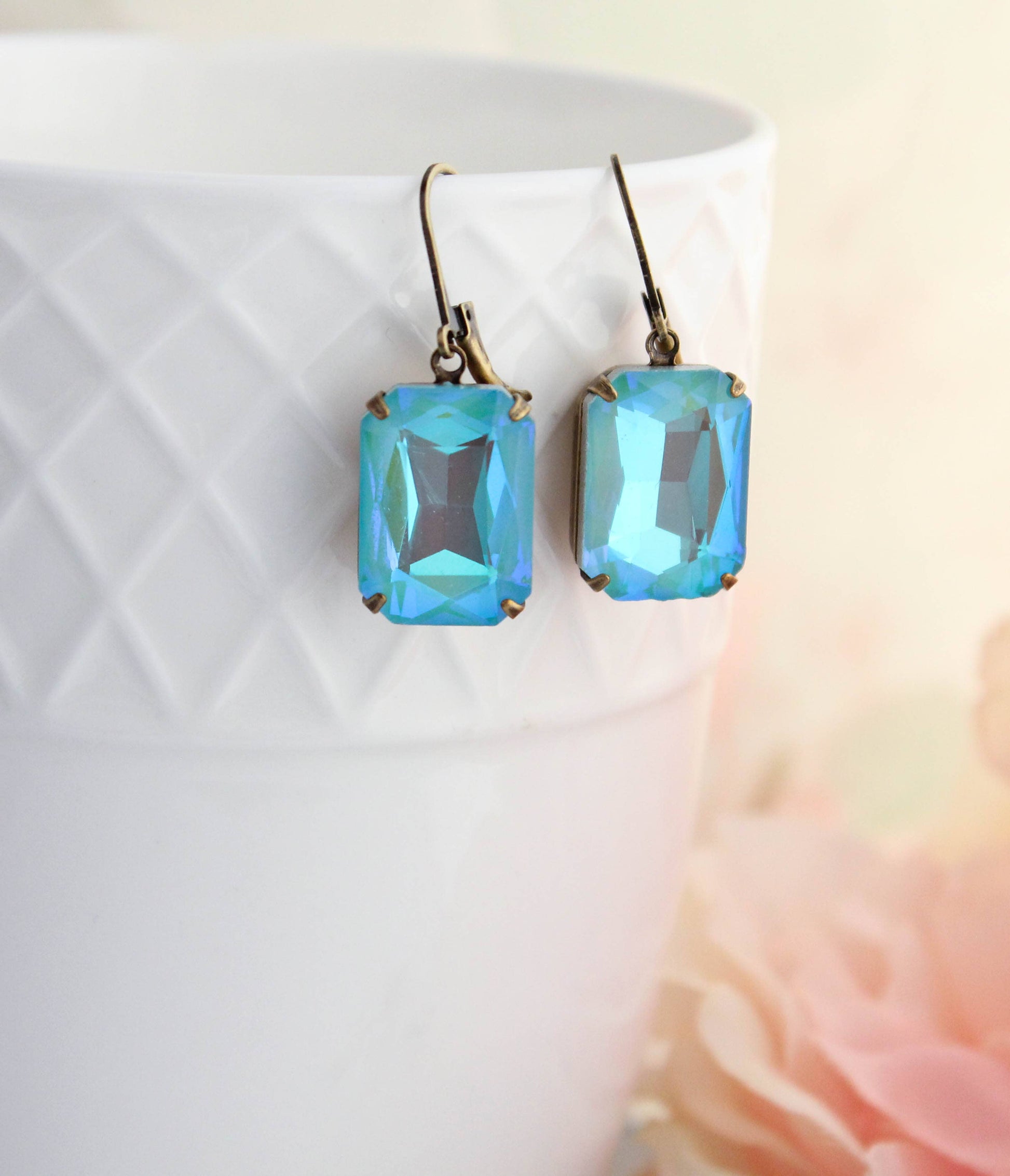 These are beautiful vintage style rhinestone earrings in sparkling sea blue green! The large Aquamarine Shimmer glass jewels are set in antiqued brass settings. These are lightweight colorful drop earrings. Details: ~ The glass jewels measure 18mm x 13mm. (.75 inch long) ~ The earrings total length is approximately 35mm (1.4 inches) ~ These are drop earrings with nickel free ear wires. A Pocket of Posies is a Canadian Jewelry Company, handmade in Canada. Ships from Canada.