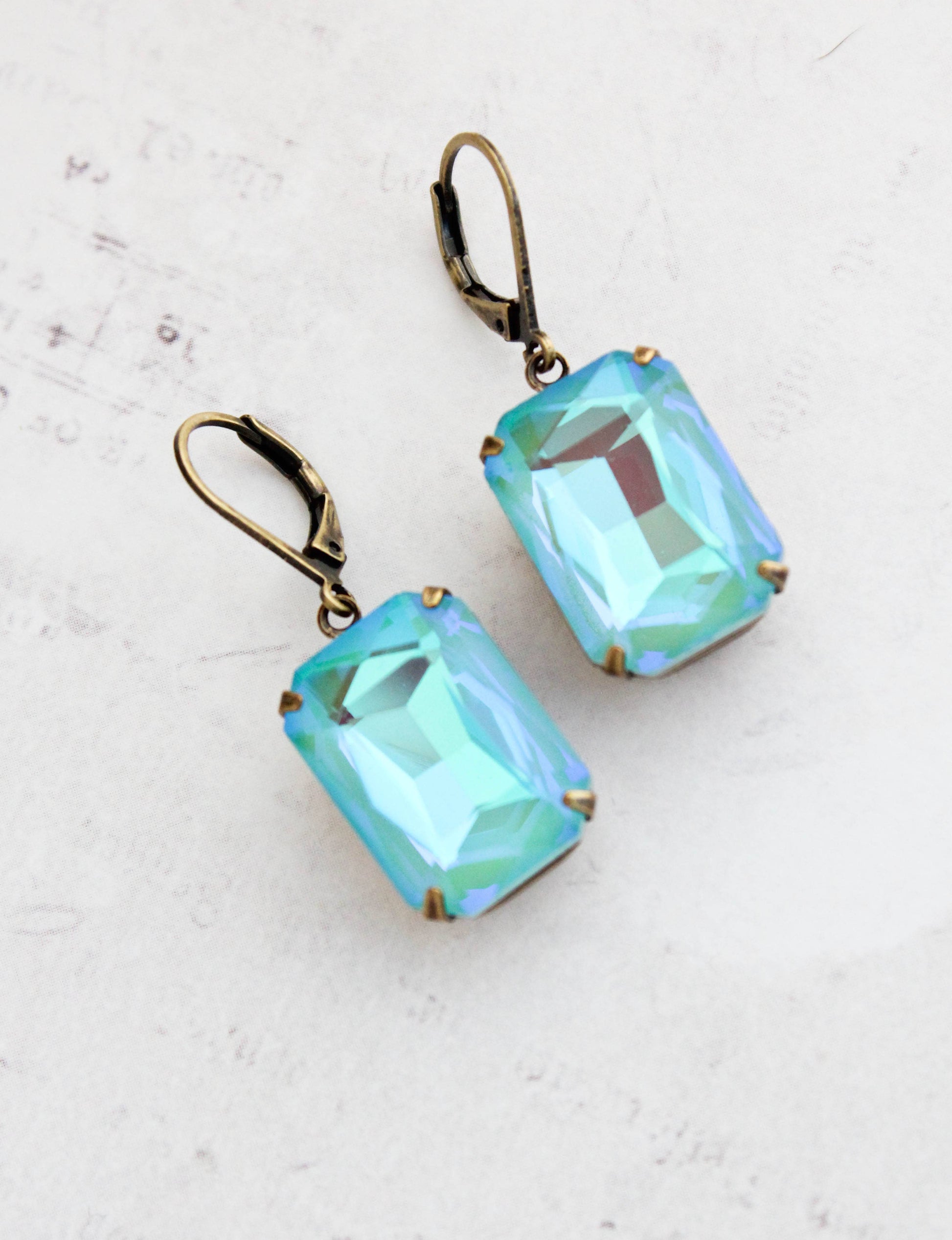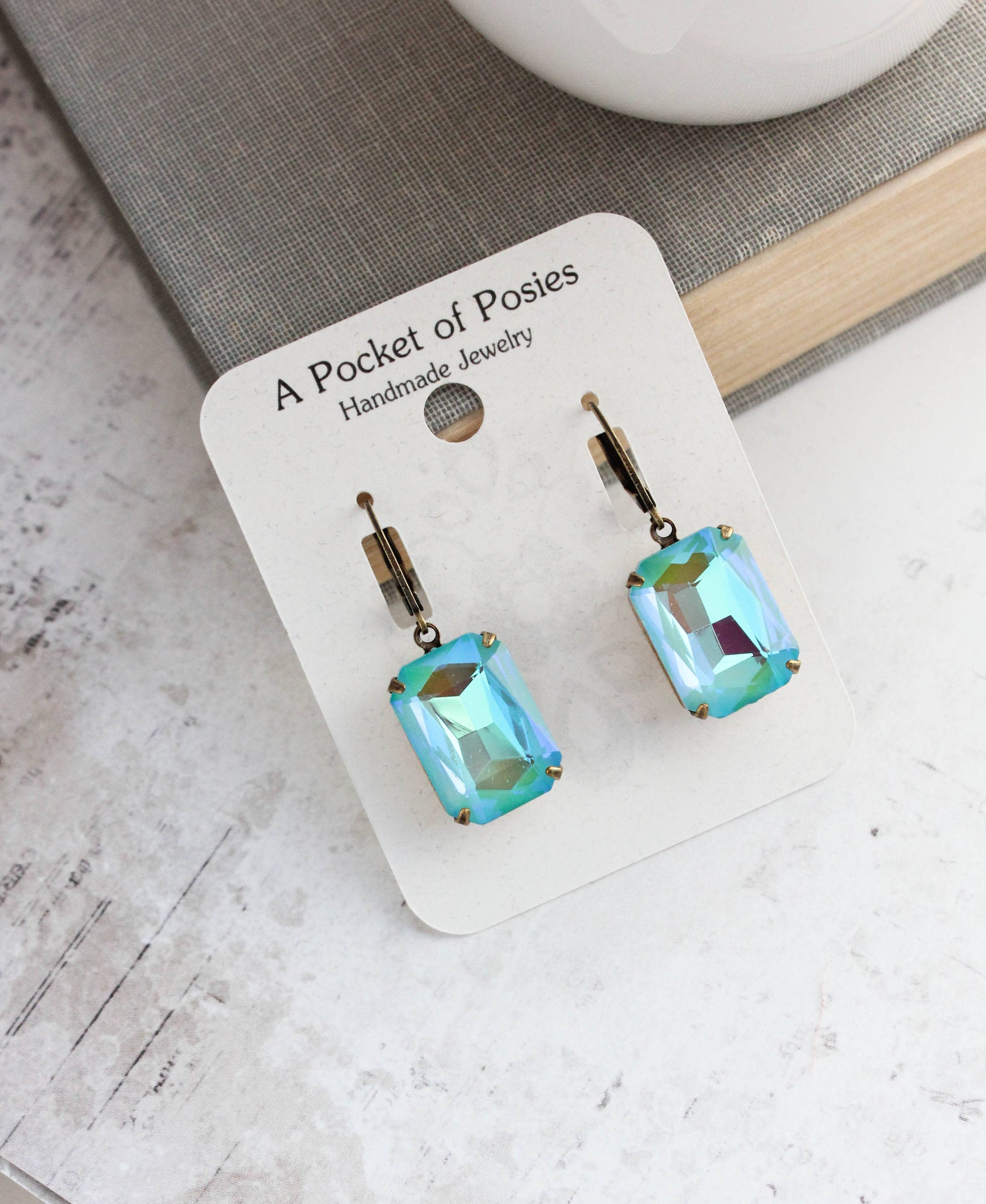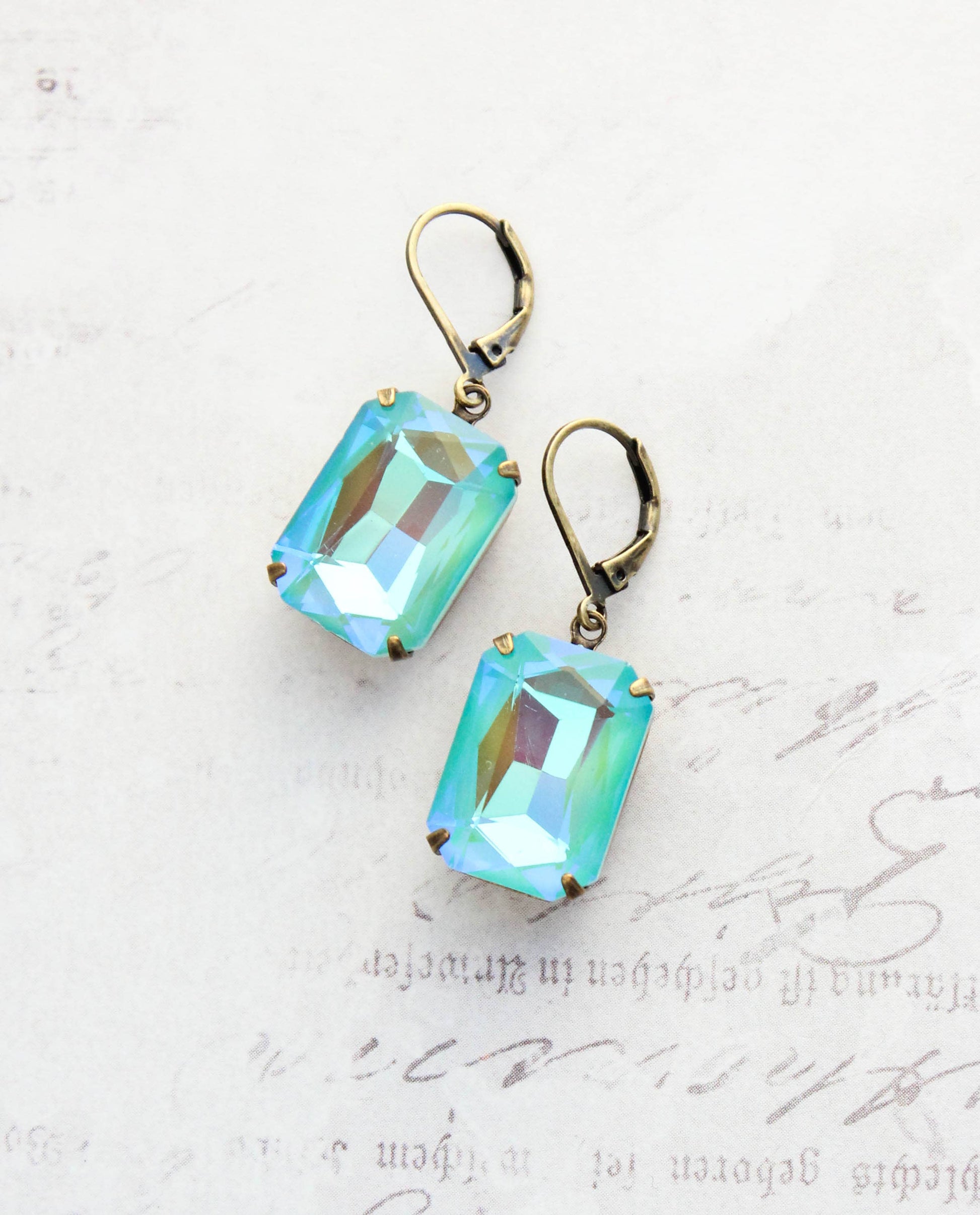 These are beautiful vintage style rhinestone earrings in sparkling sea blue green! The large Aquamarine Shimmer glass jewels are set in antiqued brass settings. These are lightweight colorful drop earrings. Details: ~ The glass jewels measure 18mm x 13mm. (.75 inch long) ~ The earrings total length is approximately 35mm (1.4 inches) ~ These are drop earrings with nickel free ear wires. A Pocket of Posies is a Canadian Jewelry Company, handmade in Canada. Ships from Canada.