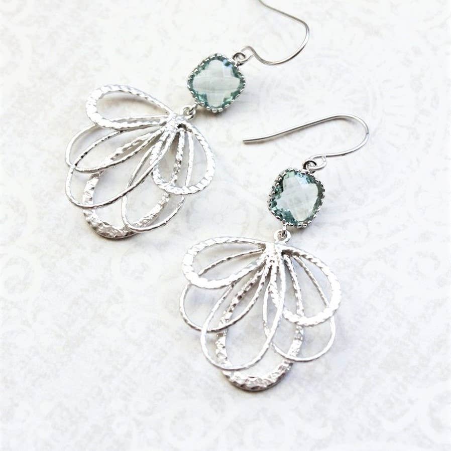 These are lovely abstract modern dangle earrings. The square aqua glass stones are set in silver plated brass crown settings and from the bottom of these jewel drops hangs a pretty floral looping filigree. These are silver plated brass lacy filigree loops and the ear wires are silver plated french hooks. These earrings measure 2 inches (50mm) in total length.