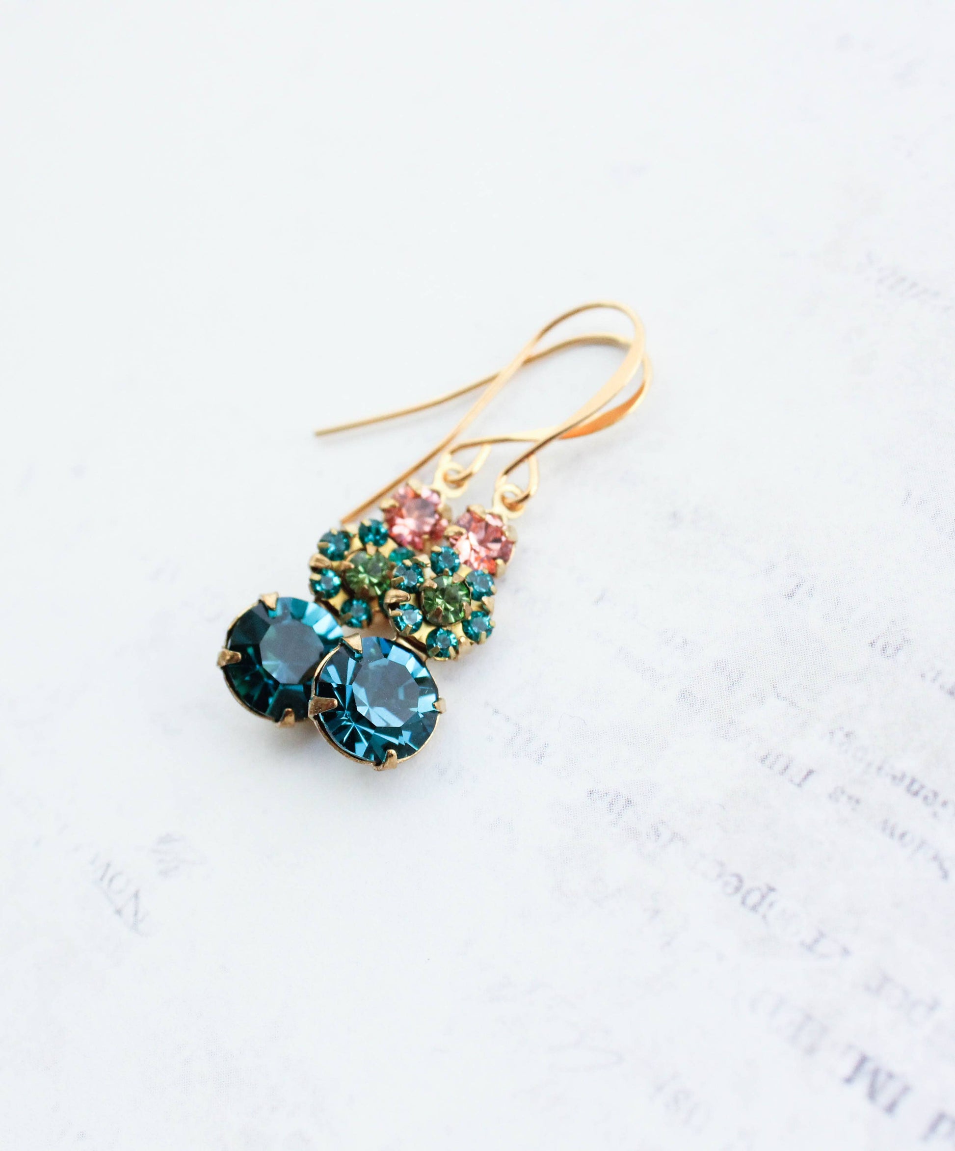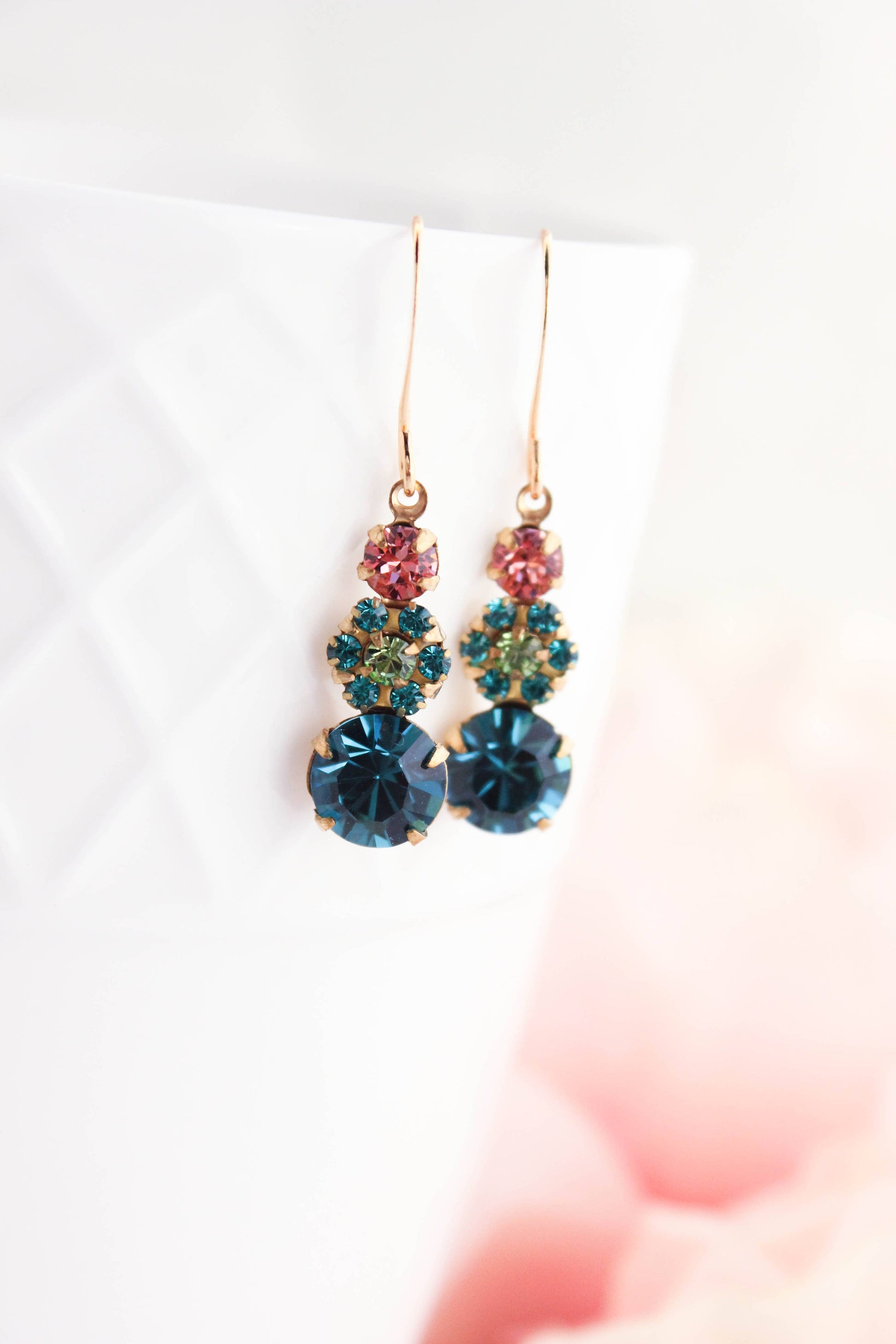 These are beautiful vintage glass drop earrings in shades of Blue Zircon, Rose Peach, Peridot & Indicolite! The three Swarovski and Preciosa crystal rhinestone jewels are are set in raw gold brass settings. The middle jewel is a floral shaped cluster of peridot and indicolite glass. These are lightweight and catch the light beautifully. Details: ~ The glass stones are Blue Zircon, Rose Peach, Peridot & Indicolite Glass and Austrian Czech preciosa. ~ The three jewel drop measures approximately 23mm and the total length of these earrings is approximately 1.25 inches (32mm). ~ These ear wires are gold brass and are nickel free.
