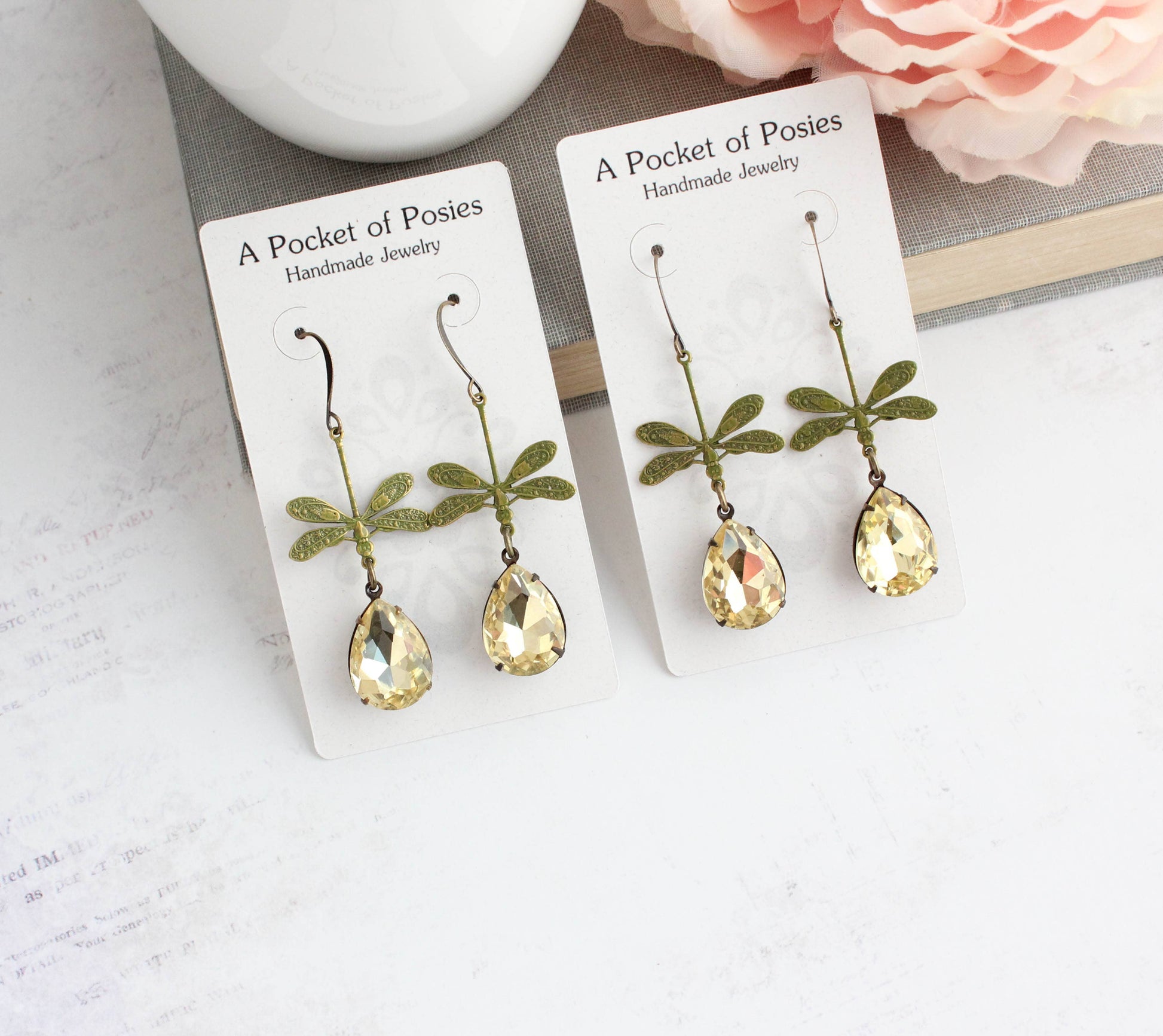 These earrings are moss green patina dragonflies and light yellow jonquil vintage glass dangles! This nature inspired design is created with a lovely detailed dragonfly and dropping below is a light yellow vintage glass teardrop set in a prong setting! These are lightweight with lots of movement and the jewel catches the light beautifully! Details: ~ Total length of these earrings are approx. 2.25 inches (57mm) long from the top of the ear wires. ~ These earrings have nickel free gold plated fish hook ear wires.