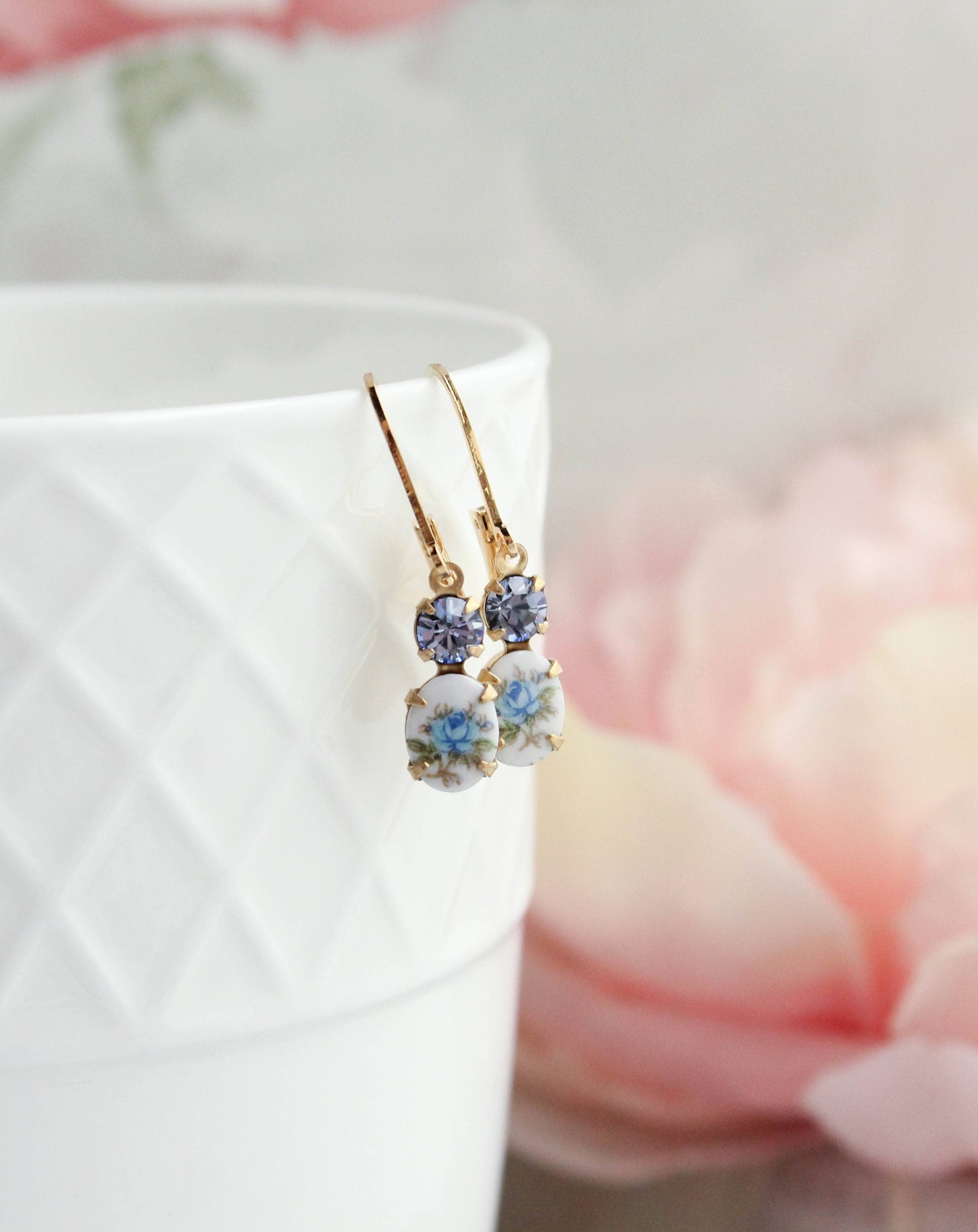 These are beautiful tiny blue rose cameo drop earrings! The small vintage oval glass cameo with a blue rose design on white and light blue Swarovski crystal jewel are set in gold brass prong settings.