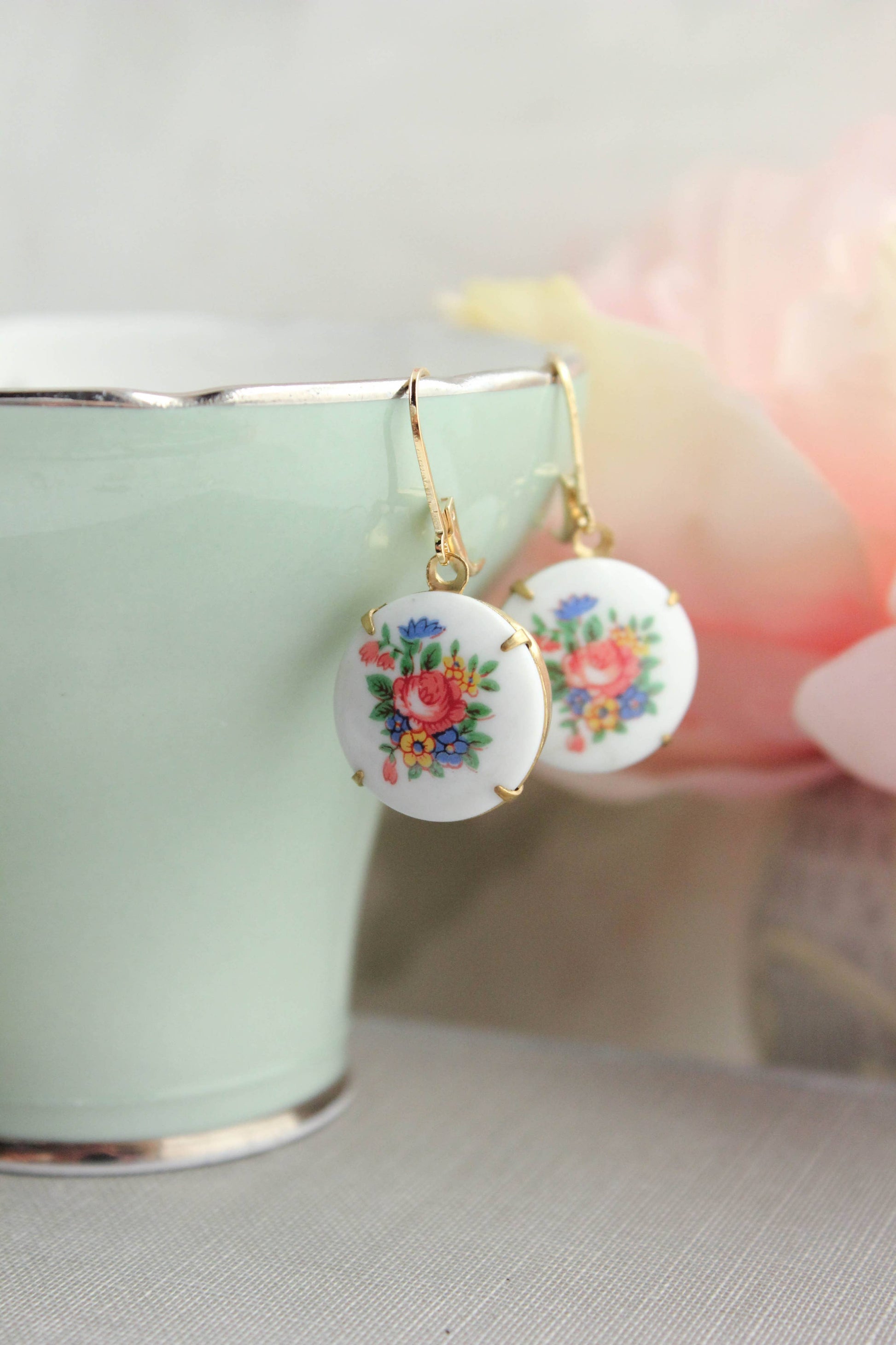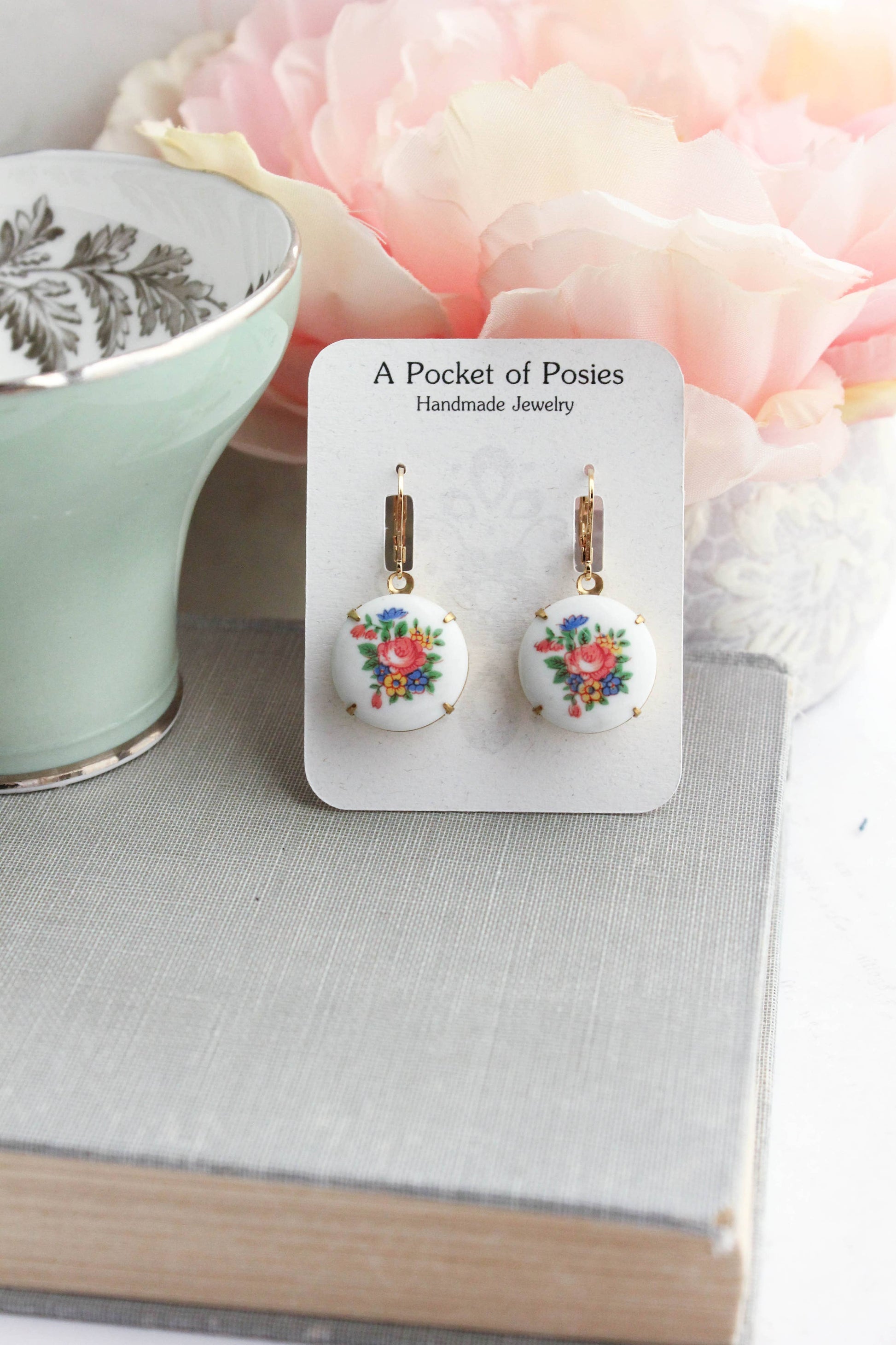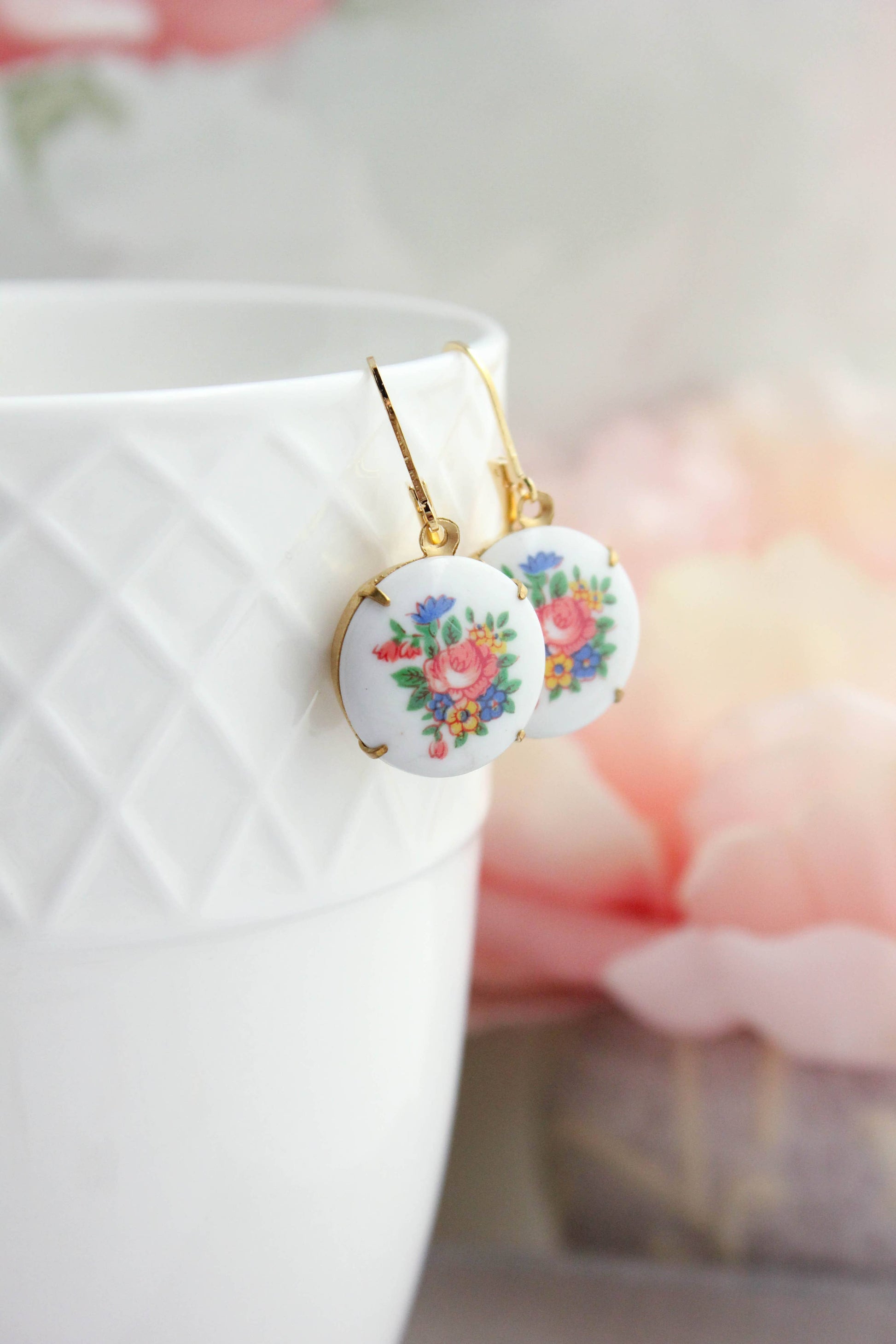 These are beautiful floral glass cameo drop earrings! The small vintage cameos are set in gold brass prong settings.