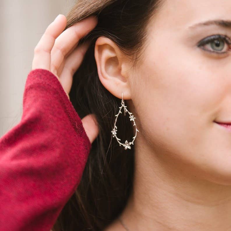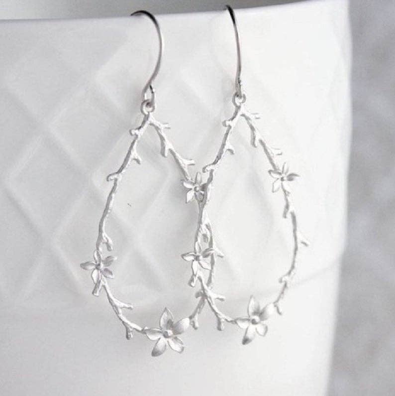 This is a gorgeous pair of twig and flower earrings in matte silver rhodium. These beautifully detailed dangles are silver rhodium plated brass. The delicate flowers are set on the twig inspired hoops. These are lightweight and will be a favorite go to accessory for any event.