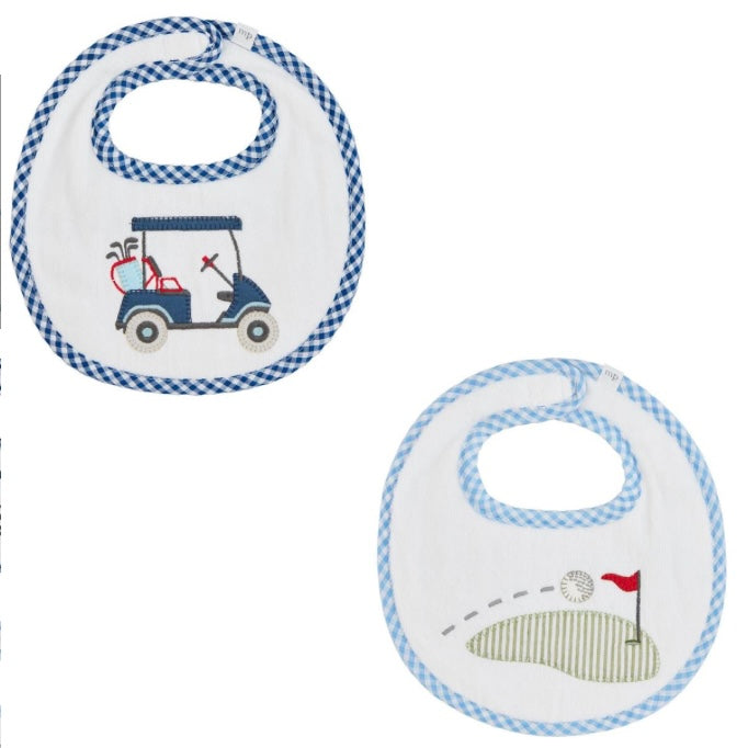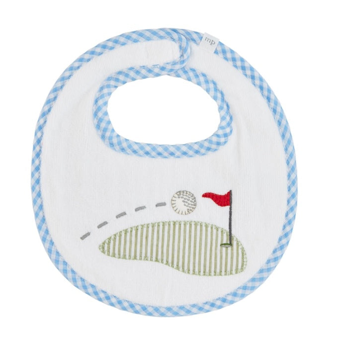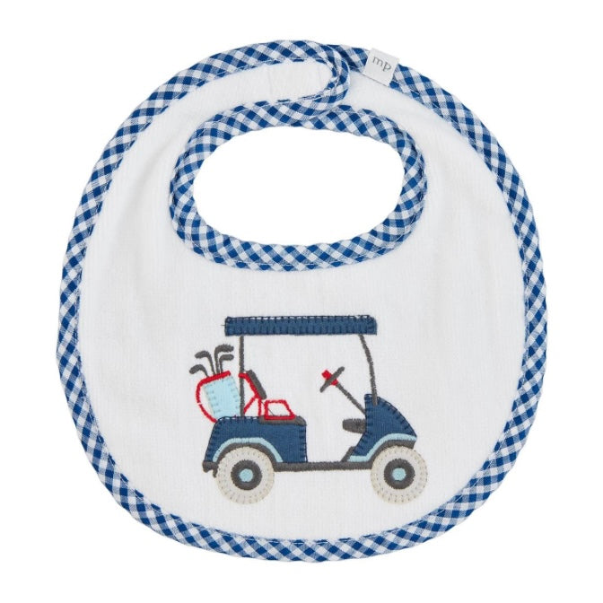 Appliqued velour terry cloth bib with contrast gingham binding and hook and loop closure