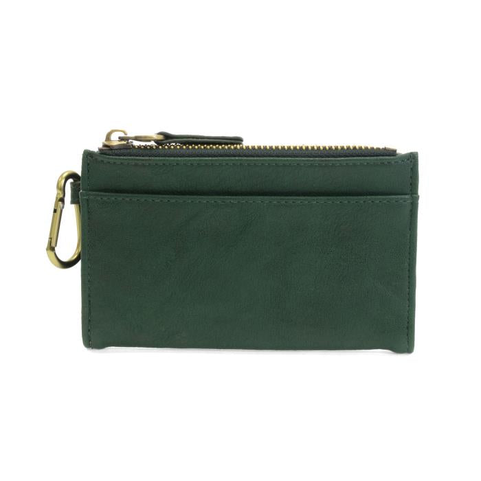 Slim and compact but with full wallet function, meet Bobbie! Loaded with 6 credit pockets, an ID window, 2 billfold pockets, a large zipper pocket and an extra slide pocket on the exterior plus a removable carabiner to hang your keys or hang on your bag you will have space for everything. Fashioned in our super soft tumbled vegan leather and accented with our signature Joy Susan logo zip pull.