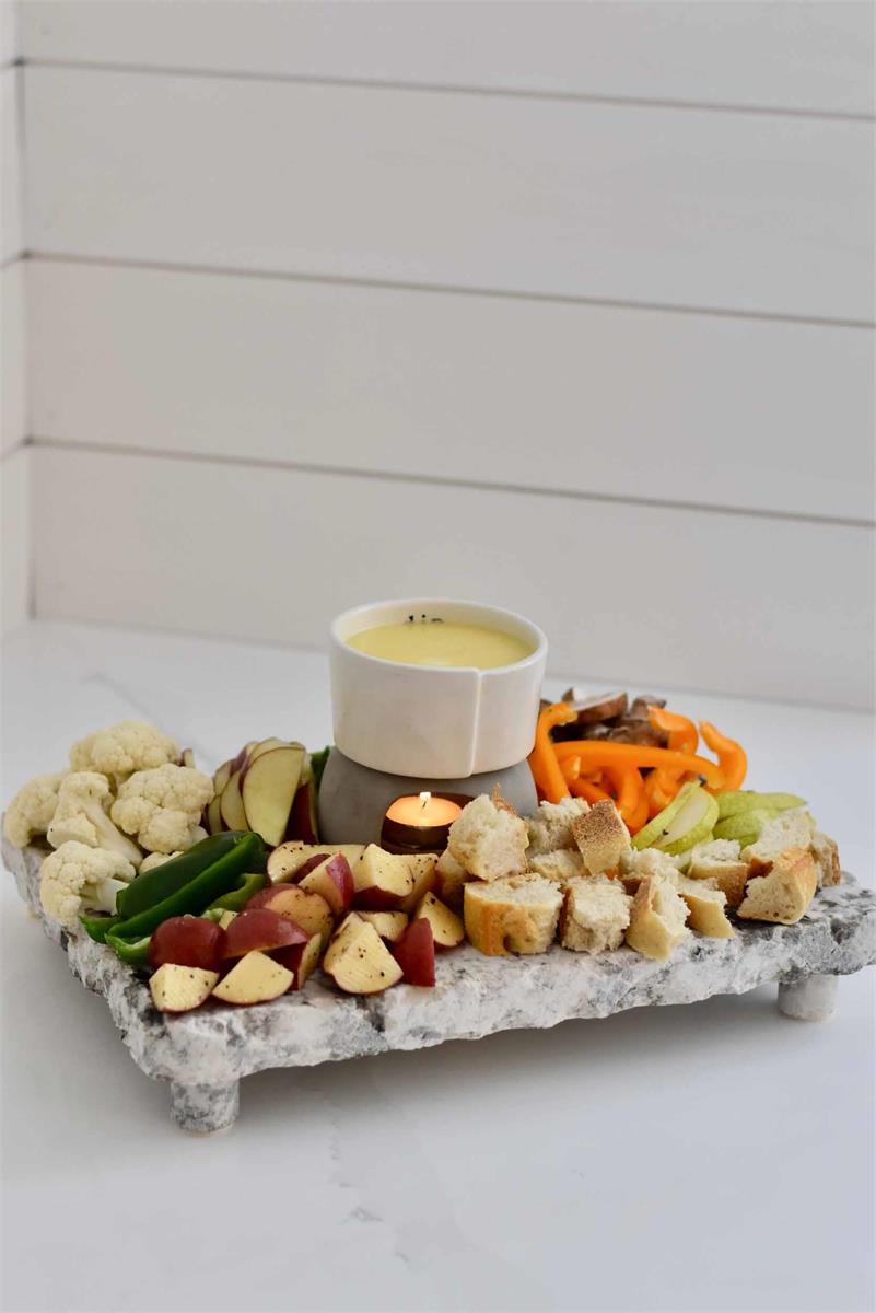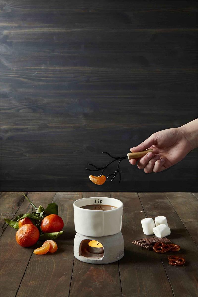 4-piece set. Stoneware fondue bowl rests on concrete warming base with included tea light. Set comes with metal wire and wood roasting fork.