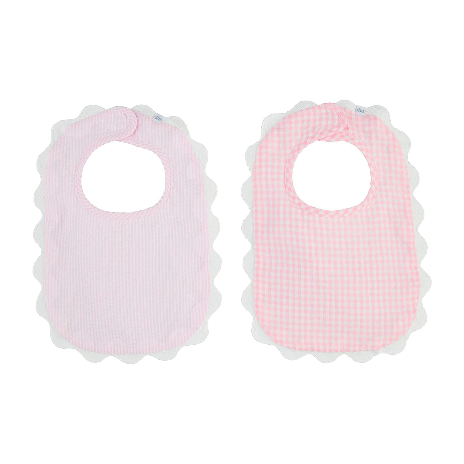 Gingham and seersucker bib features oversized scallop ric-rac trim and cotton interlock backing. Hook and loop closure.