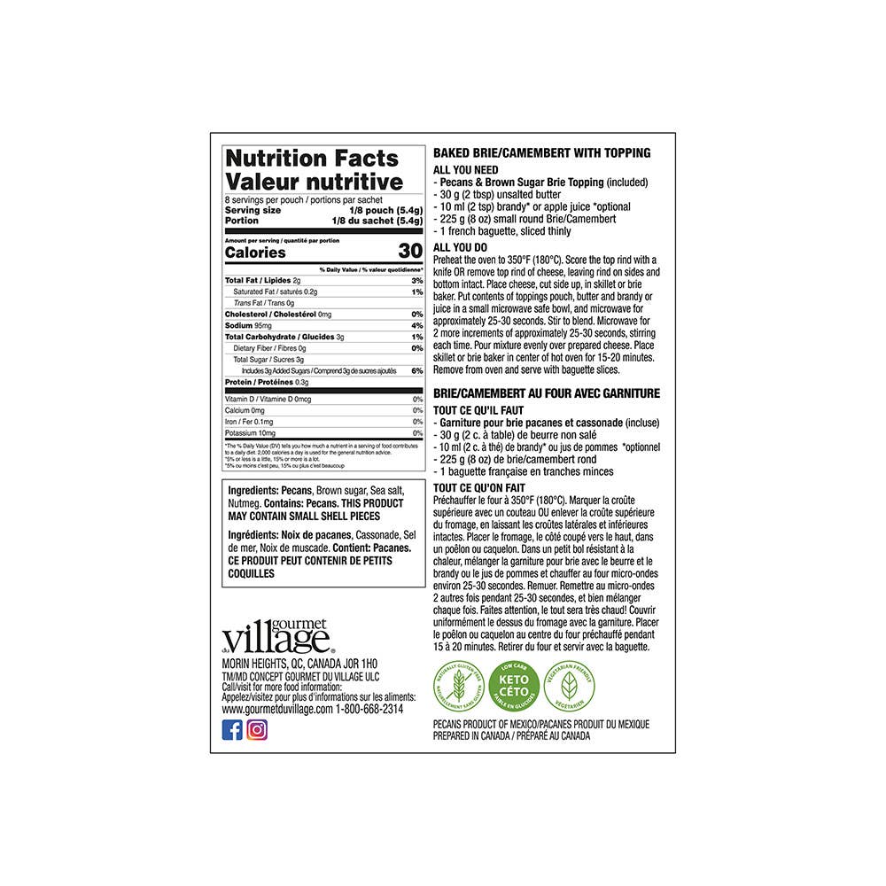 Pecan Brown Sugar Topping. Place prepared toppings on a round of Brie or Camembert in an oven-proof dish, bake in the oven (350F/180C) for 15 to 20 minutes, remove and serve with crusty artisan bread.