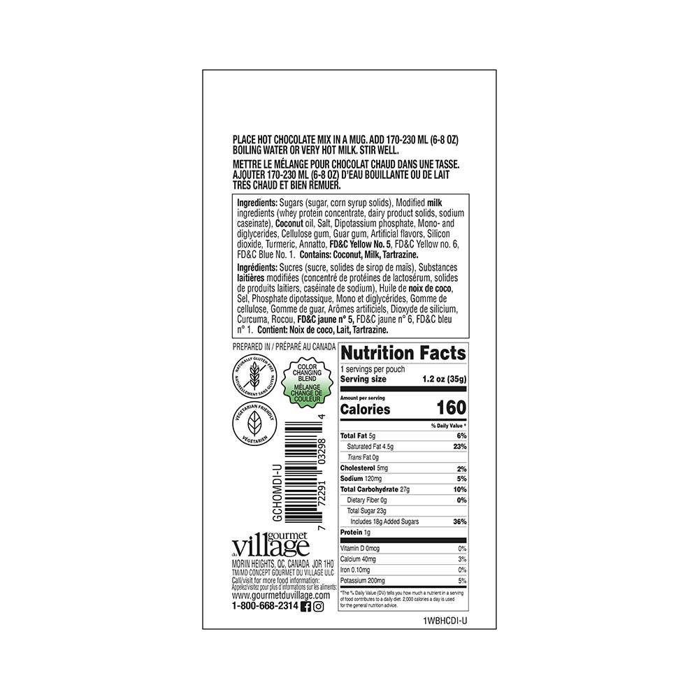 Green colored White Hot Chocolate. Each pouch makes one mug of our finest White Hot Chocolate blend, acreamy vanilla taste with a hint of coconut which then magically changes color when you add hot water or hot milk. ZERO Trans fat.