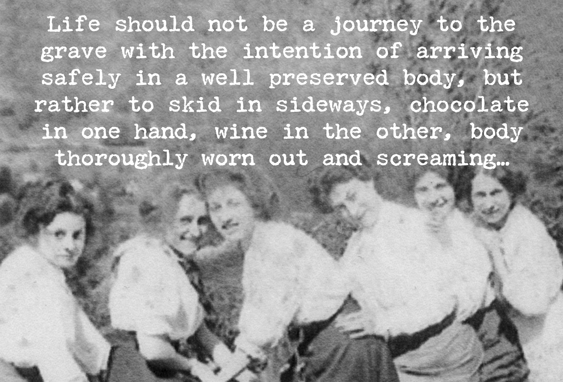 A humorous greeting card lending a vintage photograph to coordinate with its outside "Life Should Not Be A Journey To The Grave With The Intention Of Arriving Safely In A Well Preserved Body, But Rather To Skid In Sideways, Chocolate In One Hand, Wine In The Other, Body Thoroughly Worn Out And Screaming..." sentiment and inside "Woo Hoo, What A Ride!" sentiment. Made in the USA.