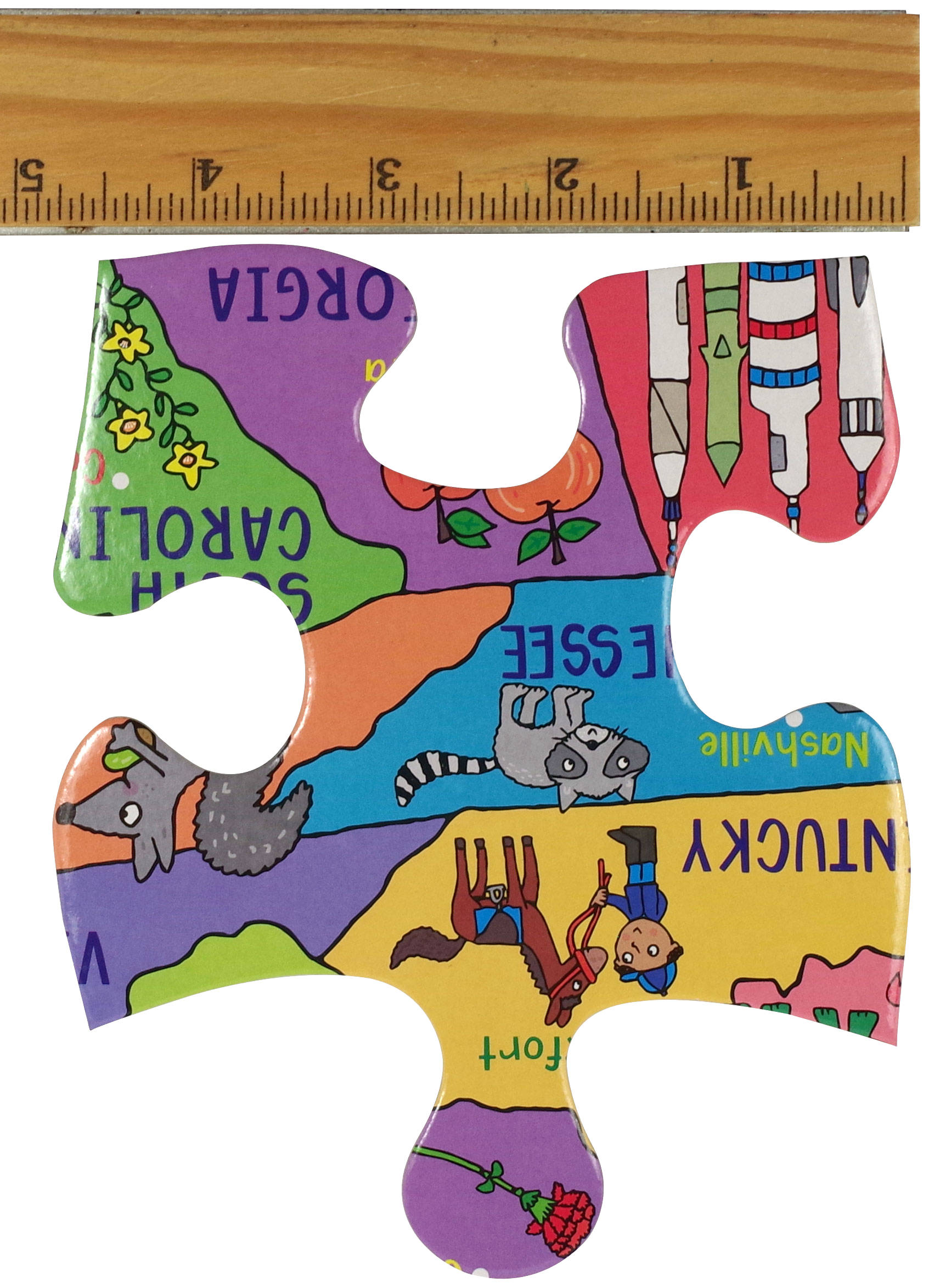Let your kids have fun, learn, and be challenged by this colorful USA Map Floor Puzzle ! Precision-cut pieces fit snugly. Pieces are extra thick. United States puzzle will take your child on a tour of America, covering every state, along with its landmarks, animals, natural wonders, and more! Vivid full-color images. Helps develop problem-solving skills. Lots of fun for ages 3 and up. Durable puzzle board. Easy-to-clean surface. Finished puzzle measures a big 36'' wide x 24'' high. Box measures 11.63'' wide x 3'' deep. 48 puzzle pieces.