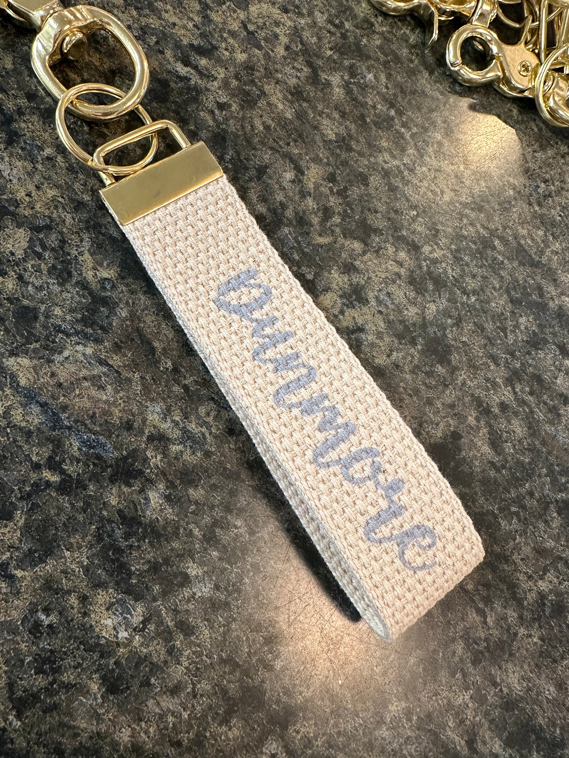 We have personalized your new go-to accessory. Keychains are made of a durable cotton webbing and a high-quality gold toned metal clasp, to securely hold keys and car fobs together in one place. Our items are handmade and are intentionally PERFECTLY IMPERFECT.