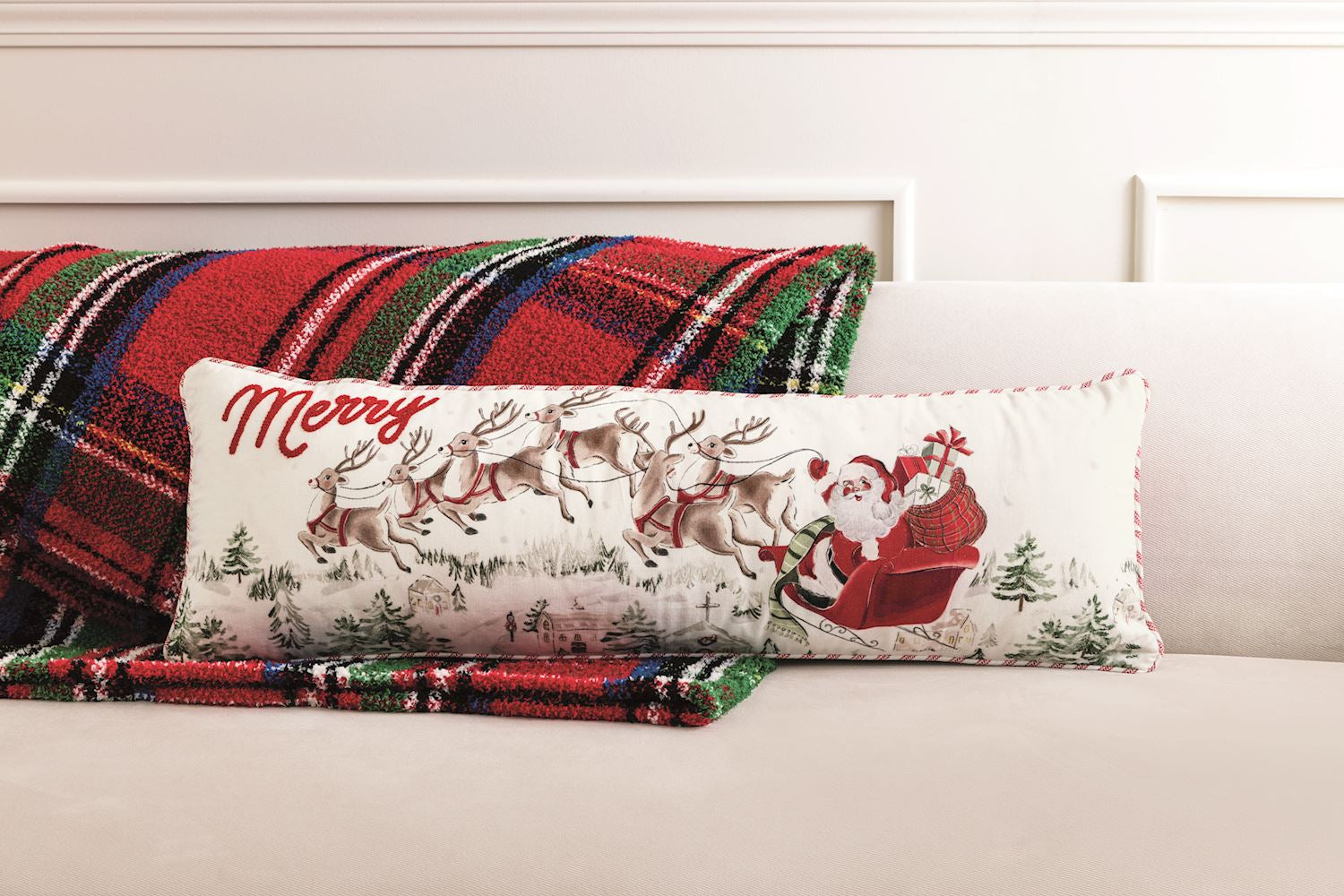 Embroidered canvas long pillow features striped piped edge, woven tartan backing and zipper closure.