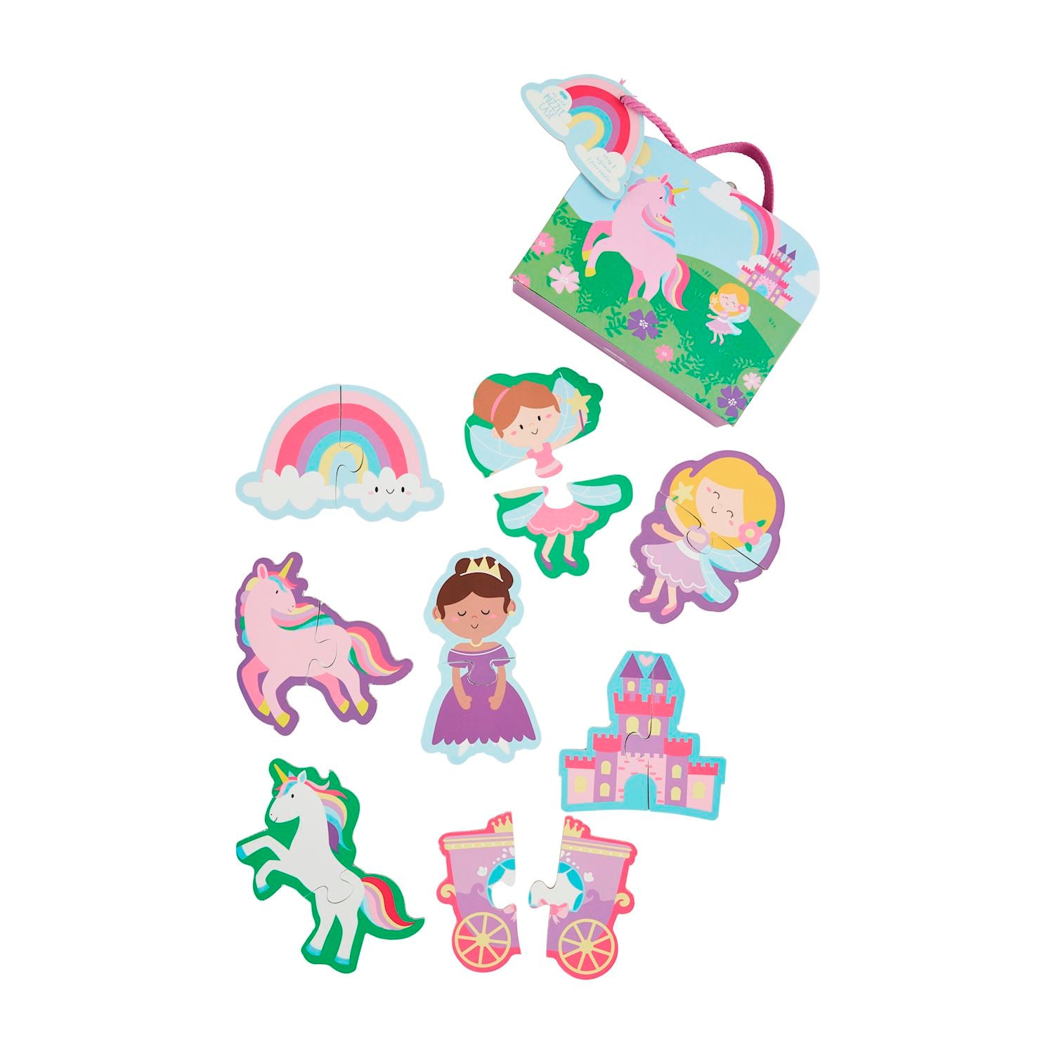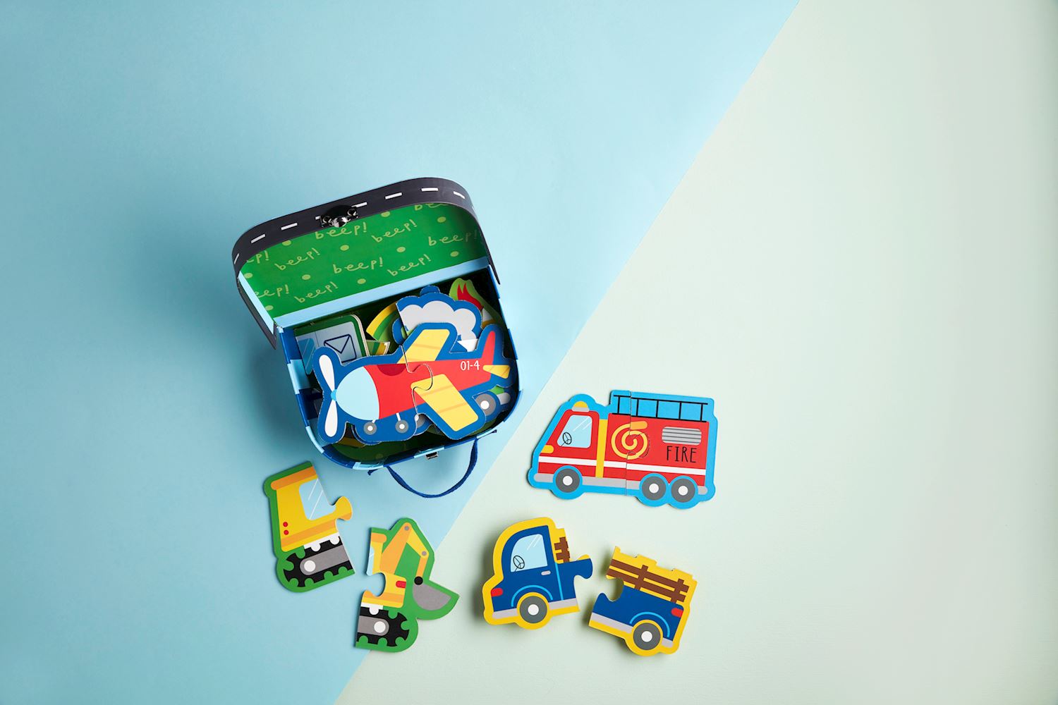 Simple 2 piece puzzles to begin learning motor skills. The 8 puzzles are packed into a handy carrying suitcase.