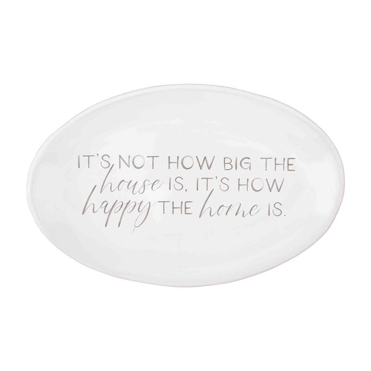 The center of the platter features the sentiment: It's not how big the house is, it's how happy the home is in a script gray font.