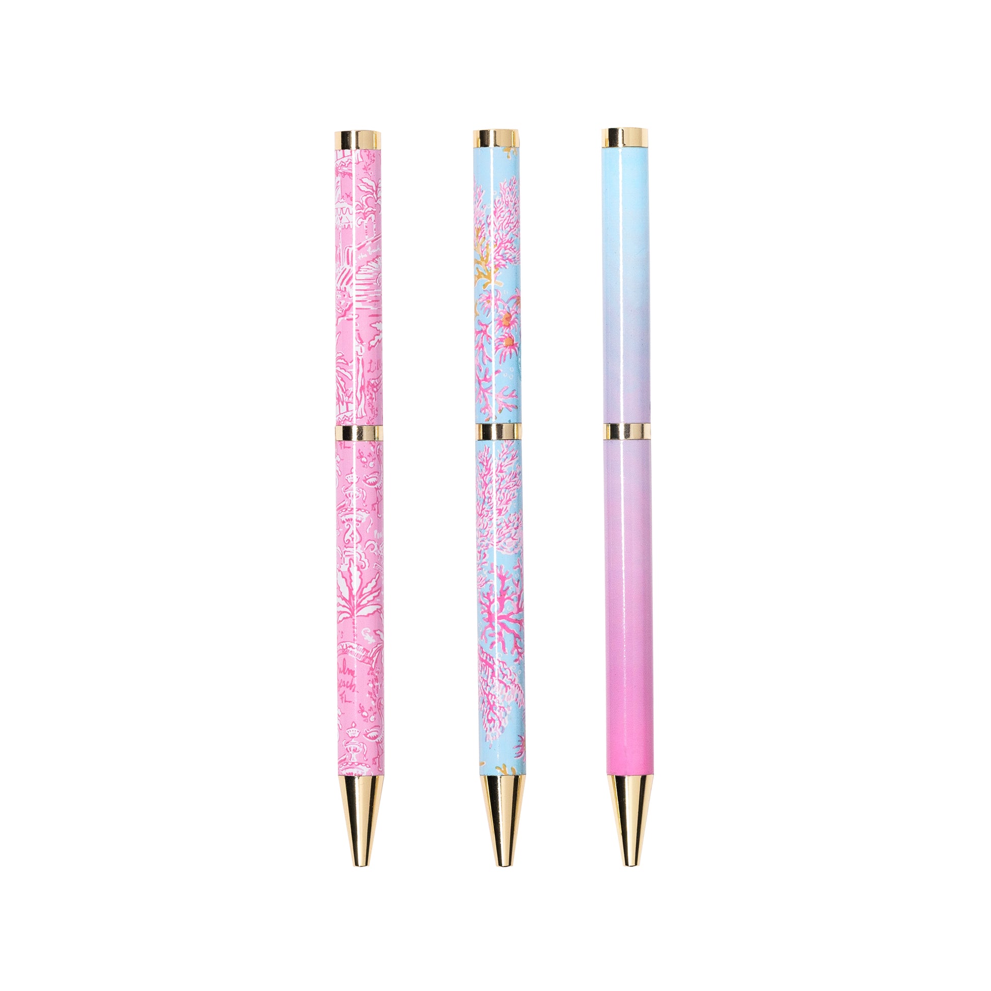 Jot down your next great idea or packing list with this set of 3 pens in assorted Lilly patterns with blank ink.